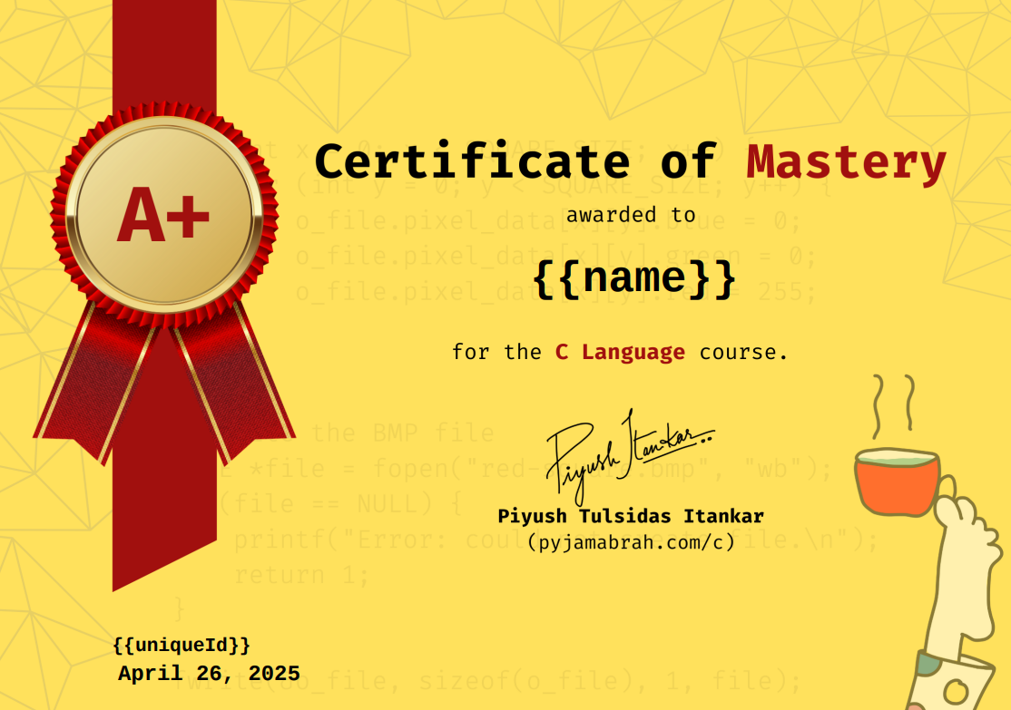 What you see above is a sample certificate. The design of this certificate will be modified from time to time to make it more shiny and reflect the rightly earned pride!