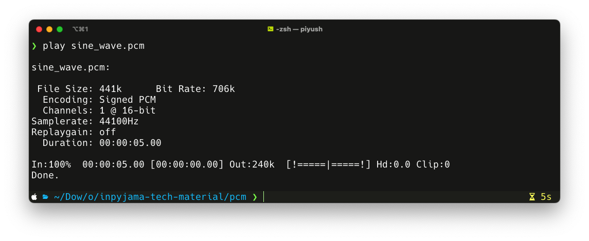 This should generate the since_wave.pcm file. This file can now be opened in any of the audio players. I used the play commandline player to play the file.